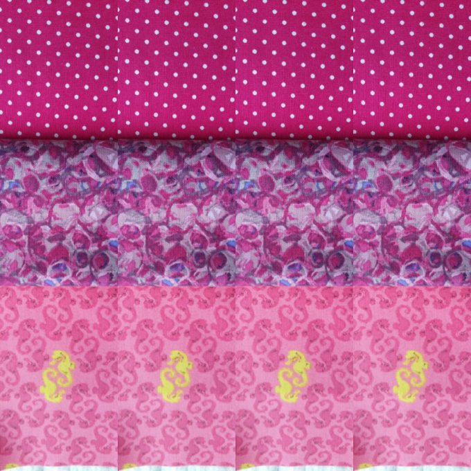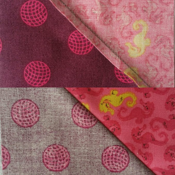 Now lesson number two: fabric looks different depending on it’s neighbours. You know that. I knew that. But I never have experienced it before. The center fabric is on the pink side now. Though it really looked purple when I pulled the fabric. See here: