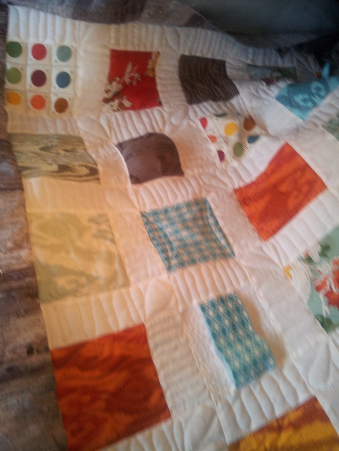 I was absolutely not sure that I would manage to finish the quilt as I wanted to custom quilt it. It’s not very big, but most of the designs I had never tried before. Our daughter however ran late and thus the quilt got finished in time. Just under the Wire. Teamwork that is!