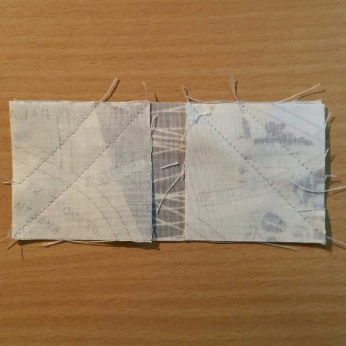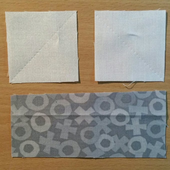 I did the ears and tail with stitch and flip. So draw a diagonal line on all 3 pieces 2″ x 2″. Or use this handy tool to make it quicker.