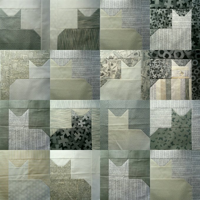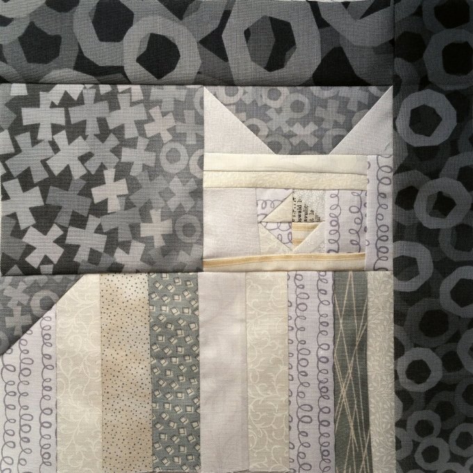 Also I ask you to use the same fabric for all the background pieces. The cat can be uniform or scrappy what ever you like. But the background needs to be coherent to make the pattern work.